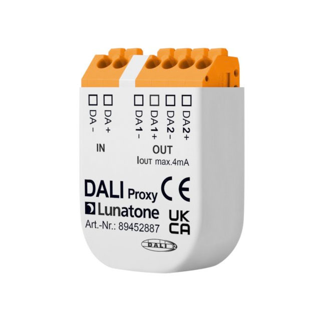 Das kompakte Modul dient der Erweiterung eines DALI Kreises und ermöglicht einen einfachen Austausch der am Ausgang angeschlossenen Geräte ohne Neuadressierung. Es repräsentiert eingangsseitig einen Teilnehmer am Bus und leitet die empfangenen Befehle Broadcast an die zwei dahinterliegenden DALI Geräte weiter. Damit können die zwei am Ausgang angeschlossenen Geräte über eine DALI Adresse gesteuert werden.